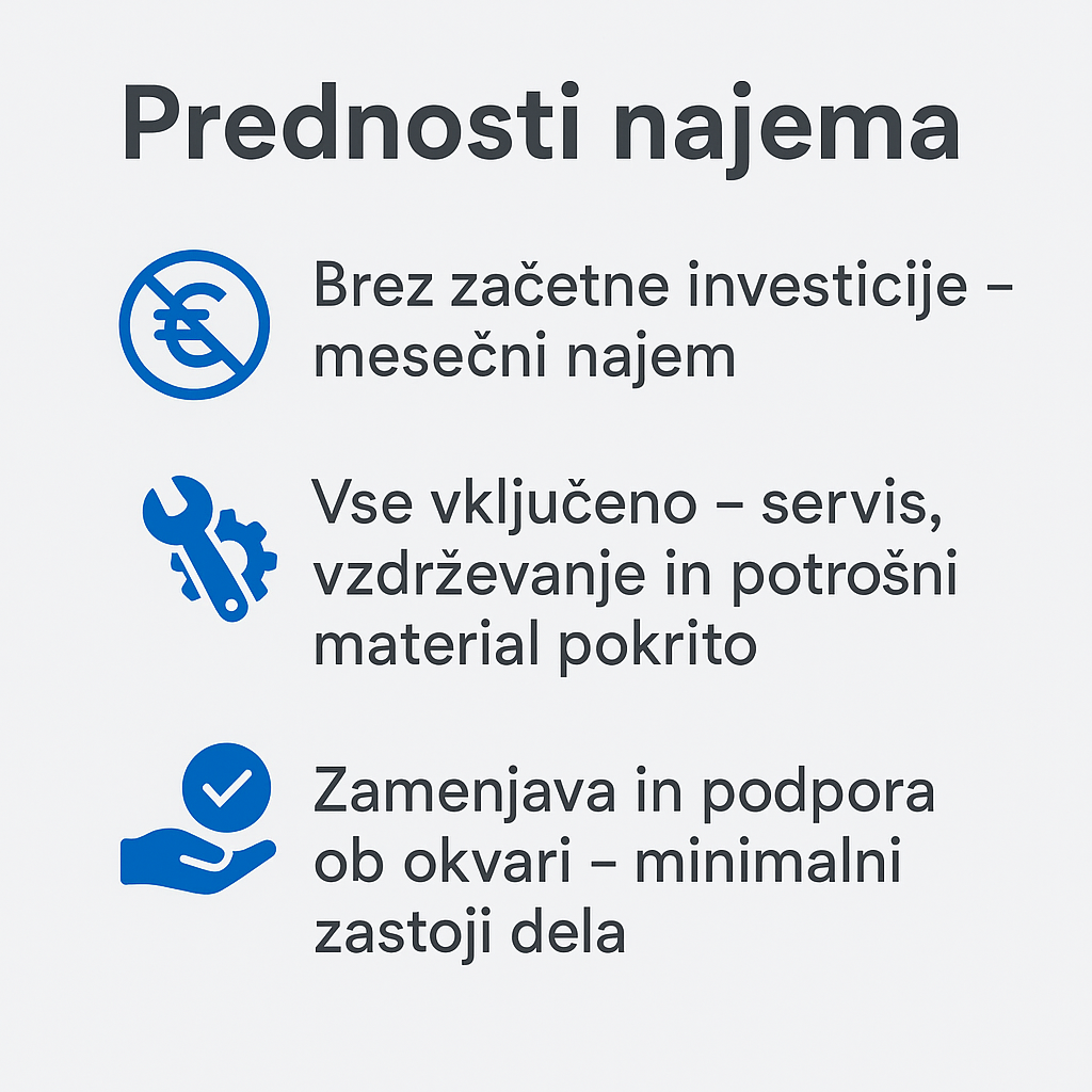 Prilagojeni paketi najema kjer je vključeno vse: naprava, servis, potrošni material, podpora - brezskrbno tiskanje po vsej Sloveniji.